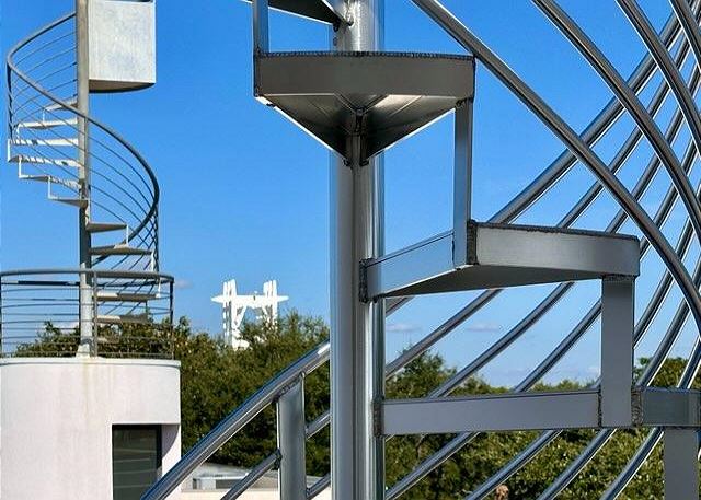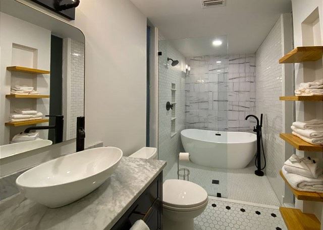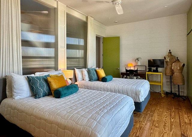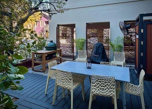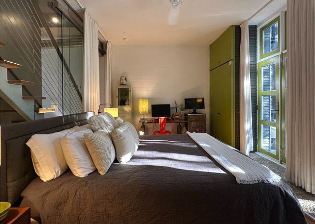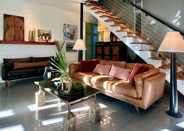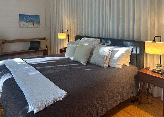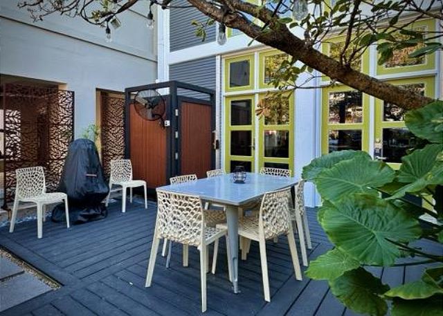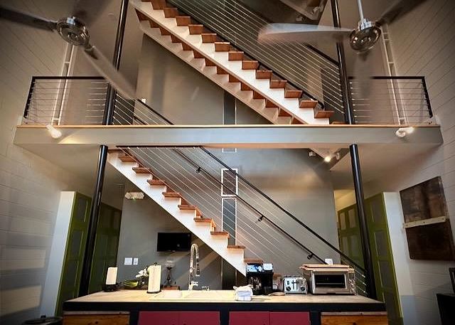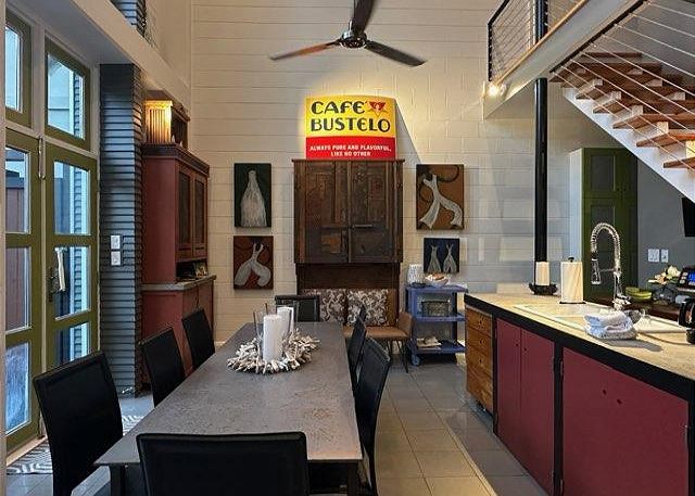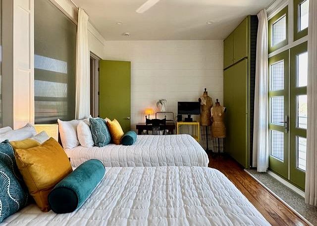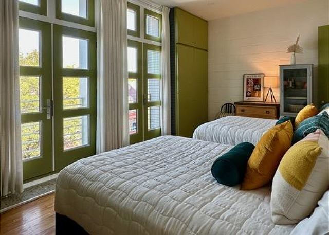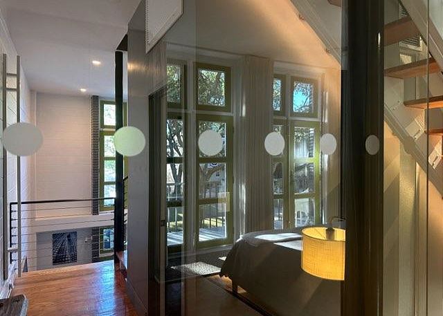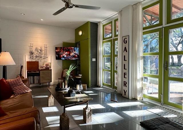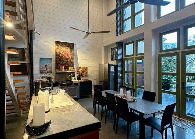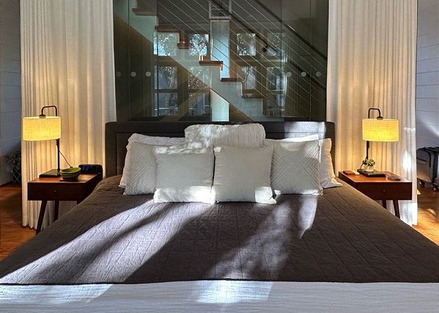 Ruskin Park is an outdoor extension of your downstairs living area, while the private outdoor courtyard to the back is a great spot for enjoying lunch and dinner. The chef in the family will enjoy preparing meals in the open two-story kitchen which includes a Garland gas stove, concrete countertops, Breville appliances, sous vide cooker, Big Green Egg BBQ grill, and even a paella pan for those who want to take advantage of the local seafood. After dinner enjoy the musical ambiance provided by the vinyl turntable and house collection of vintage jazz, blues and classic rock LPs. As the day winds down, ascend the open, floating staircases which seem to suspend from the walls to the upper floor bedrooms and roof decks.