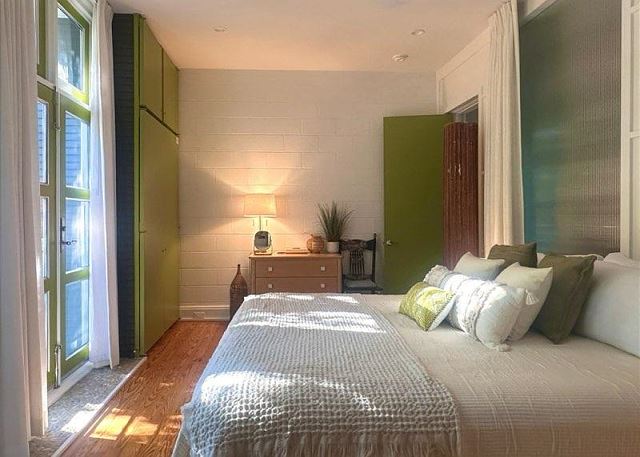 Bedroom 1: King bed, fully remodeled hall bath, private balcony overlooking Ruskin Park, full length privacy glass wall, doors and curtains, Smart TV