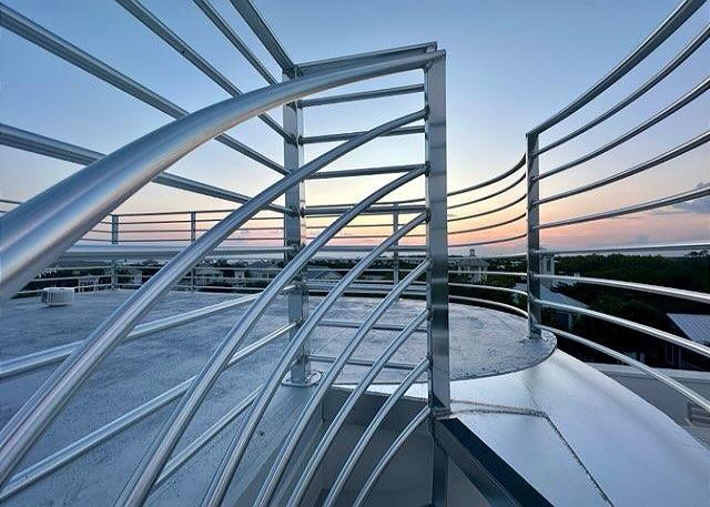 Though the years, the Forsythe House has been featured in a variety of architectural publications and is sure to be a one-of-a-kind vacation for family and friends. Much like the shops of Ruskin Place, Forsythe House offers a little variety for everyone. Enjoy spectacular sunsets from the spacious rooftop terrace boasting one of the best vantage points in Seaside. Choose from the newly completed upper 5th floor Sky Deck with panoramic view of the Gulf from east to west, the lower roof deck with a covered sitting area and sunrise chairs to the east, or the western rooftop deck with a large dining table and chairs overlooking the beautiful gulf sunsets.